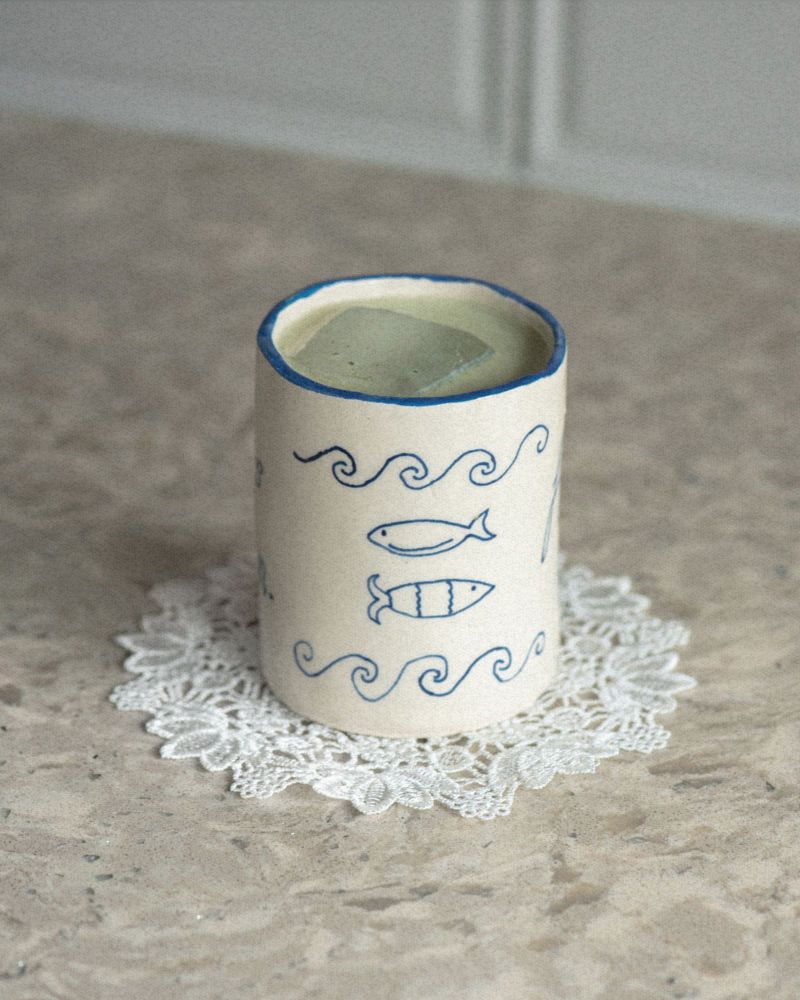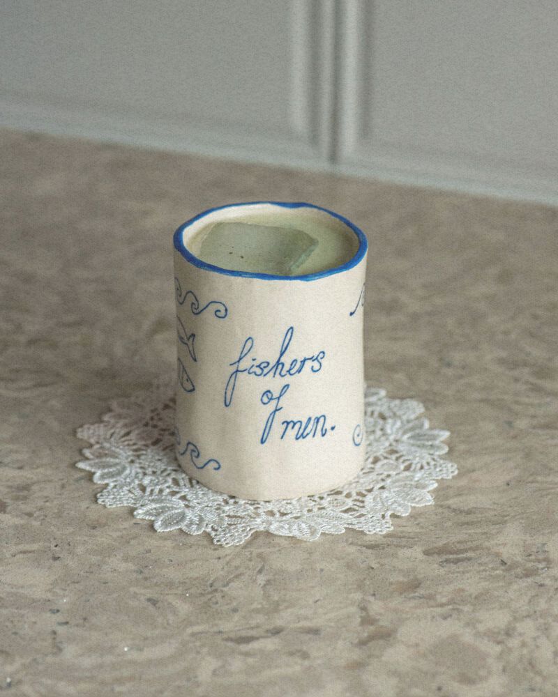 Mediterranean inspired Fishers of Men handleless mug, made with love right here in England! Designed to remind you of God’s promise.